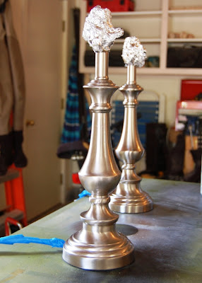 The first step was to prep the lamp for painting! I sure do love paint. I wiped the lamps down really well to get rid of any dust or dirt, and covered several inches of the cord and any electrical parts that might not function as well covered with spray paint. I used blue painters tape for the cord and aluminum foil for the light bulb-doohicky part.