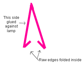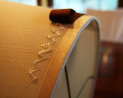 Anyhow, I grabbed my trusty glue gun, turned the shade on its side and went at it. (Note: I actually tried regular white glue applied with a brush first, thinking it would help eliminate any hot glue "bumps." But I was much happier with the finished look after using a glue gun. I think the double-fold made a big difference -- you'll see why in a moment.)