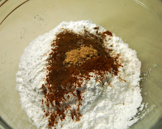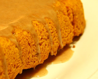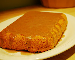 While the cake cools, make the glaze. Combine 1 3/4 c. powdered sugar, 3 Tbs. apple cider and 1 tsp. pumpkin pie spice. (I didn't have that, so I used 1/2 tsp. cinnamon, 1/4 tsp. allspice (I was out of cloves!) and 1/4 tsp. nutmeg) It should be thick and gooey and delicious.