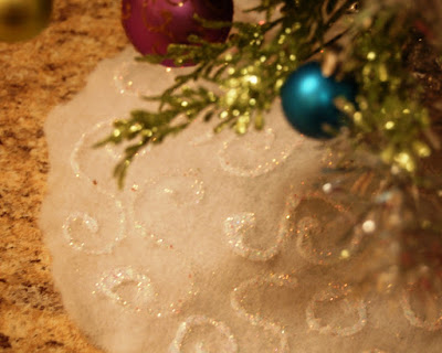 Then, since I didn't have any maribou trim left for a tree skirt and I hadn't had any luck finding pastel velvet either, I decided to make a 'snowy' tree skirt using batting, white glue, and glitter.