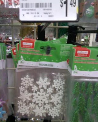 I used thread that was similar in color to the bathroom walls and these foam sticker snowflakes from Michael's: