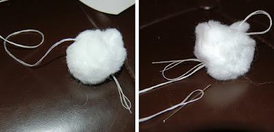 Stitch through the pom-pom, pulling all the thread through, then go back through the pom-pom the opposite direction creating a loop (seen on the right side of photo #2 below) -- don't pull the thread all the way back through this time.