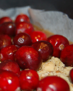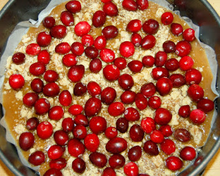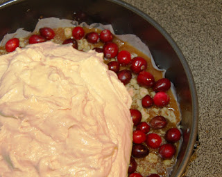 Then just pour this caramelesque nectar of heaven into a prepared springform pan (I lined mine with parchment paper) and sprinkle with fresh cranberries and pecans. (Or walnuts. Or whatever makes you happy.)