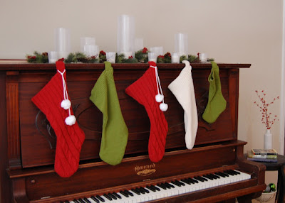 Like I said, I might go back and add fun embellishments to them after I recover from this sewing experience. I maxed out my crafty quota for a while I think. It's so out of character for me. Though I did have enough time and energy to add a couple pom-poms to the red cable knit stockings -- you know how I feel about pom-poms... I'm a fan.