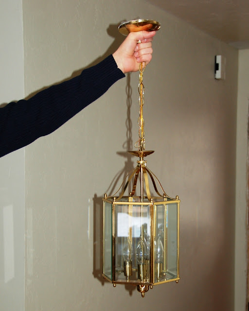 I pulled the lantern apart (taking photos of where each doohickey went, 'cause electrical fixtures are not my forte) and painted it with Rustoleum's Oil-Rubbed Bronze spray paint. I replaced the gold lamp wire with black and then put the fixture all back together again.