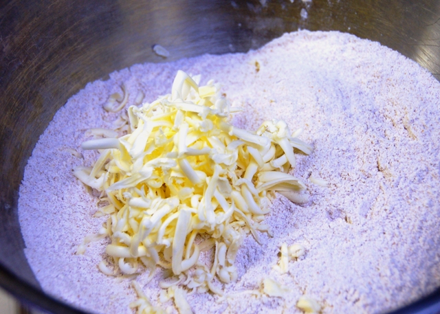 It's butter! Kate and Sara of Our Best Bites suggested freezing then grating butter before you cut it in to flour, to make it easier. This might be one of my favorite baking tips, eveeeeer. Love it! (I didn't even freeze this butter, I just used it straight from the fridge and it worked great.)