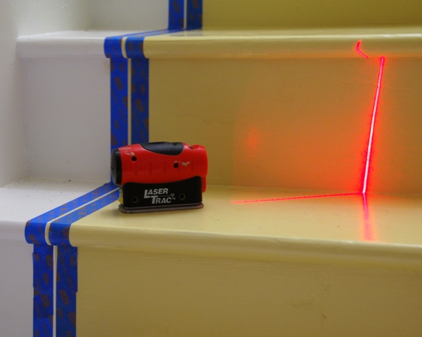 You could use a chalk line to mark the distance on each tread, but it will only mark the edge of each bullnose. I borrowed my contractor brother-in-law's laser pointer, which will go around corners so you'll have a solid line on your treads and risers which will result in a much quicker tape job.