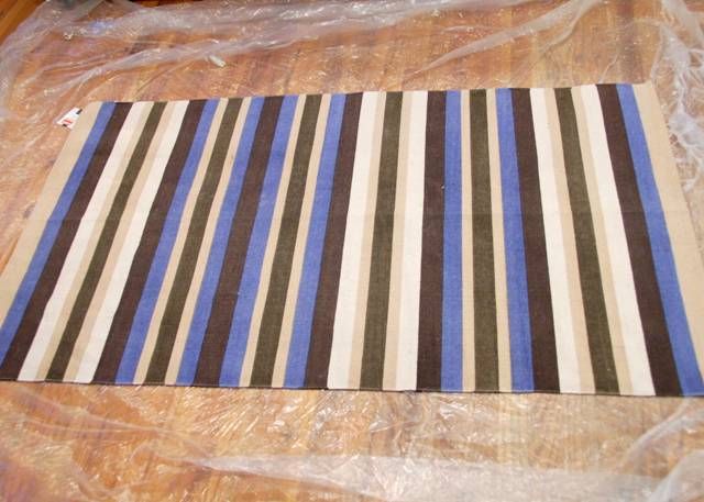 Well. I'm sort of working on my laundry room, but not really working on my laundry room right now. And since I'm not a fan of financing my decorating whims with credit cards, my laundry room budget is pretty much nonexistant right now. So when I found a flatweave rug on clearance at Target last week, I decided to try this rug painting business that's circling the blog world.