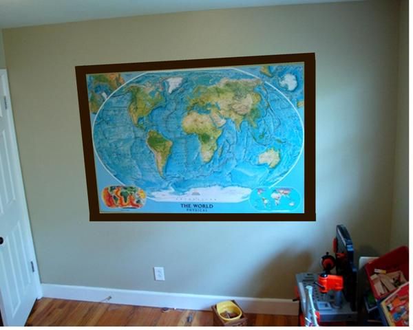 So now, my plan is to use some trim to create a frame around the map and make it look more like a piece of art while hiding the tacks, like this:
