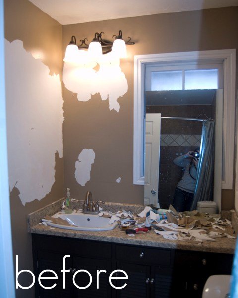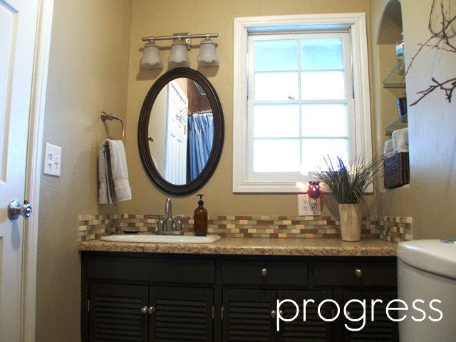 Our upstairs bathroom required a a mini overhaul which you can read about here, and this room is almost done. I need to install baseboard here too, and finish caulking around the tile backsplash.