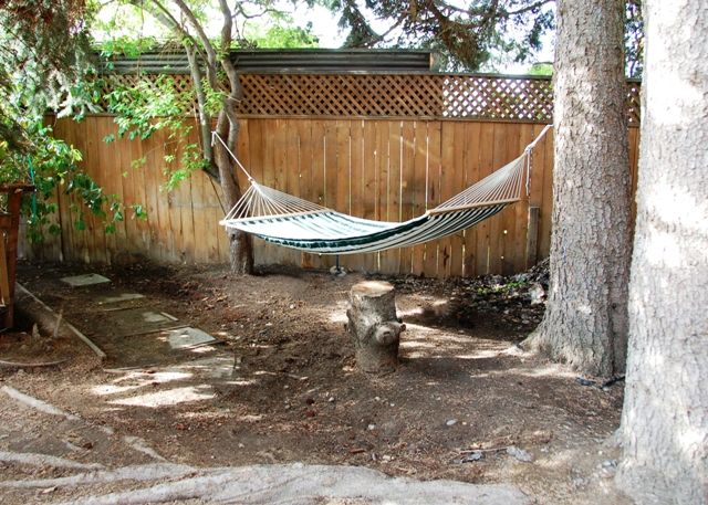 Mike was excited about his spoiled surprise though, so we decided to hang it that evening. Long story short, hanging a hammock turned into a mini overhaul of the unused corner of our yard in prepation fors its conversion into an outdoor den of manly relaxation. Except for when I'm in the hammock with a girly drink; then it shall be known to all as "the shady nook of leisurely delight."