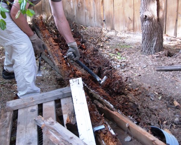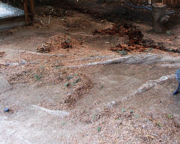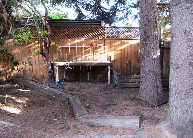 The unused corner in question is under a canopy of trees, and it was home to a wobbly potting bench, some rotting railroad ties and a compost pile which I liked in theory, but made me nervous. It was just a pile of composting material right up against the fence -- and I'm already dealing with holes in my fence on the other side of the yard from the raised garden beds that were built against the fence with nothing between the soil and the wood.