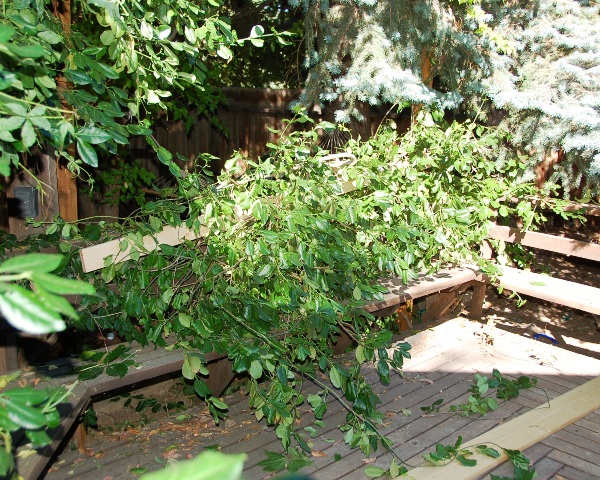 Add a couple 1x4's sneakily threaded through the plant's woody stems, screw them into the posts that my mister so graciously installed, and voila: a green monster, tamed.