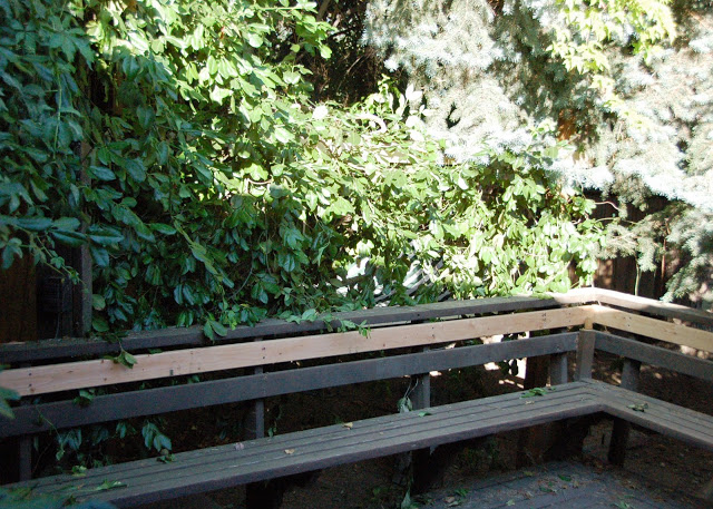 As you can see in this picture from the spring, plants had been trained to grow along wire that was stapled to the bench backs to create a green backdrop of sorts. Unfortunately, the plants had grown around both sides of the seating. And I learned really quickly that no one likes to sit on a bench if they're going to get a kidney poke from a branch or lose an eye to an ill-placed leaf. It just wasn't comfortable, and I'm a fan of functionality (without sacrificing form, of course!)