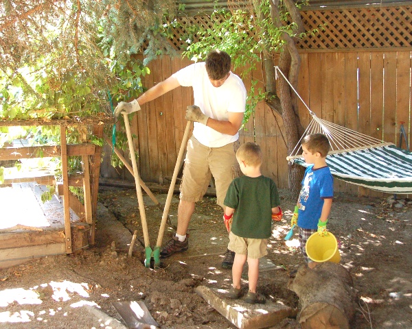 First, the mister dug holes behind the deck on either side of the bench in question (with a couple helpers complete with buckets and work gloves)