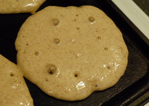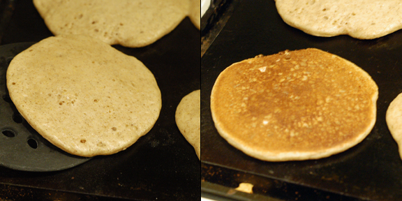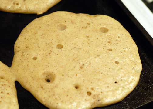 Pour 1/4 c. of pancake batter onto griddle and let cook until top has dried considerably and bubbles in the center of pancake have burst and their holes hold their shape. Flip pancake, let brown a minute or two, and remove. Serve hot.