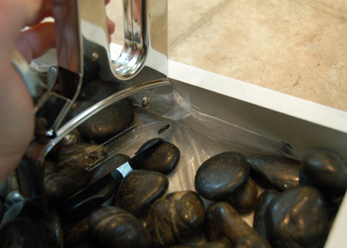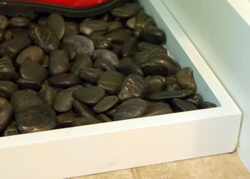 I put four foam furniture pads on the bottom corners to raise the tray off the ground just a bit and help prevent it from sliding around, and filled it with polished rocks from the dollar store.