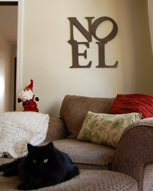 I've always admired Pottery Barn's metal 'Noel' sign, but it's a bit out of my price range ($149, ouch) and it's apparently unavailable now. Sadness. I've seen lots of creative blog types make their own version, so when I stumbled across 12" MDF letters at Michaels in a similar style, I had to grab them and get my seasonal DIY on.