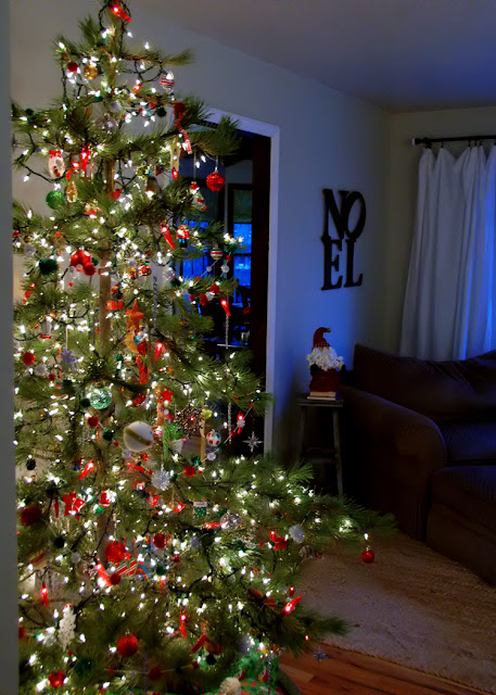 We come home and string it up with all sorts of randomness: chili lights, beads, pom poms, handmade ornaments and store bought ornaments alike. We are an equal opportunity tree decorating establishment here, and I wouldn't have it any other way.