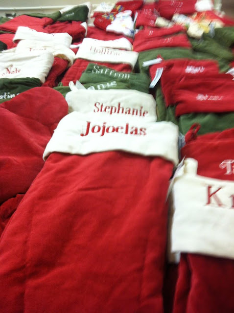 So here's how the miracle went down. There's a regional store which I'm sure lots of you have heard of since 95% of home/craft bloggers apparently live in Utah where the store is based... it's called DownEast.They have lots of fabulous furniture, accessories, linens, etc. from fabulous stores like Z Gallerie and Pottery Barn. There are plenty of scratch and dent type things, and oodles of monogrammed backpacks and stockings... some of which feature totally average names, lots of which are more bizarre exotic names like "Jojoelas" or "Saffron" -- eccentric wealthy people buying their cats PB velvet stockings, maybe?