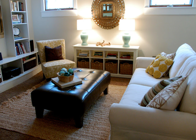 I rolled it up and dragged the jute monster in from the front room. Again, it's not the perfect size (it's the skinniest 8x10 rug I've ever seen) but I love the natural fibers in the living room. The carpet also helps keep the rug from shifting, which seems to be the braided rows' worst enemy.