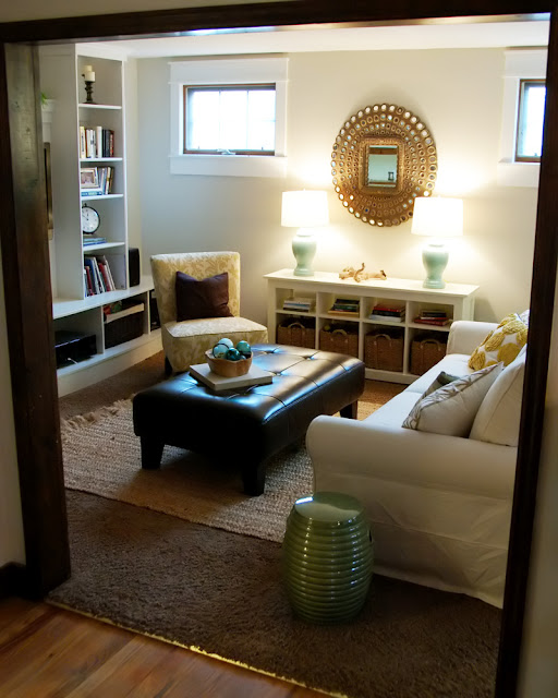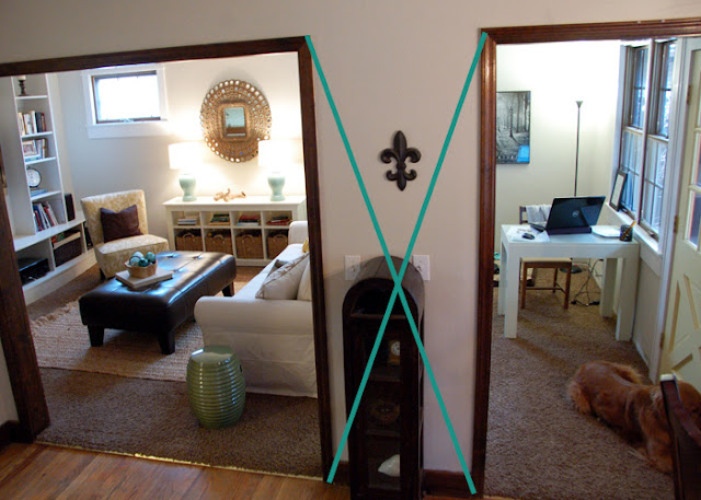 And while I'd love to eventually have a bigger rug (think 9 x 12) to fill up more of the room, it's impractical to even consider it while the "worst wall in the world" is still in place, bisecting the traffic through the room: