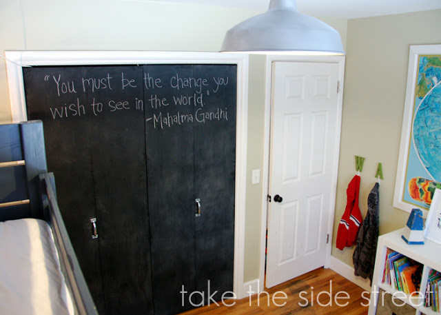ReplyDeleteOh you guys did an awesome job! So many things that I love about the space I can't decide which ones to compliment you on :) Love the chalkboard closet doors, the various art work you put above the desk, the light fixture..all so cool and well put together.