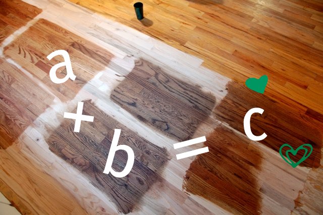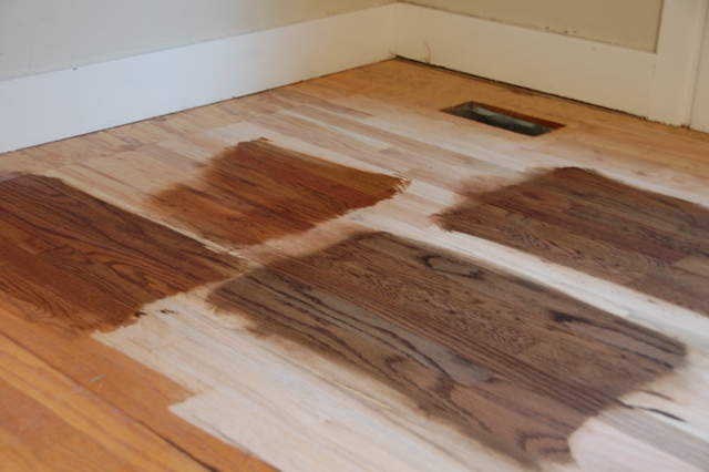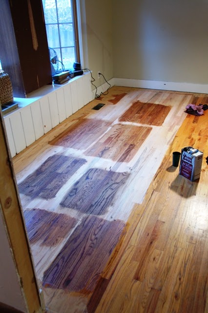 Because I am secure in my high maintenance-hood, I had the (very patient) flooring guy running around in circles for me, ultimately putting down seven different stain samples. We ruled out the top three pretty quickly, which left us monkeying around with some custom mixes...