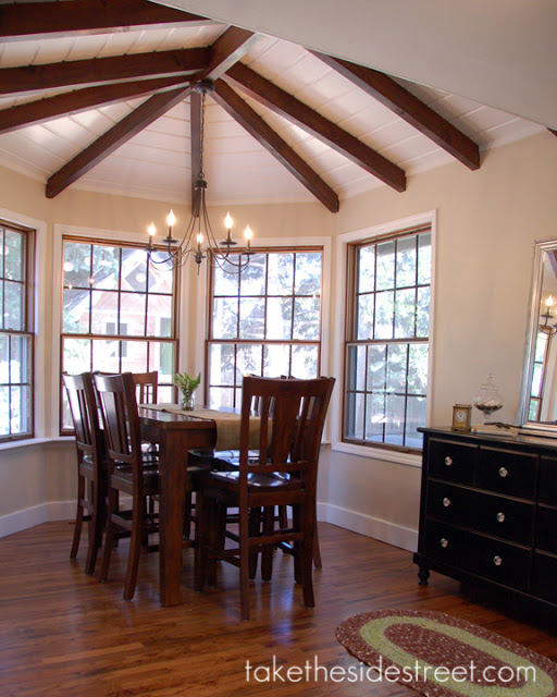 Back to the joy, though... love my dining room! Love it, love it, love it! It's so bright, and although I originally left the beams dark to appease the husband (men and their stained wood, go figure), I actually like the contrast and I think it ties the ceiling in nicely to all the dark wood windows in the room and throughout the house.