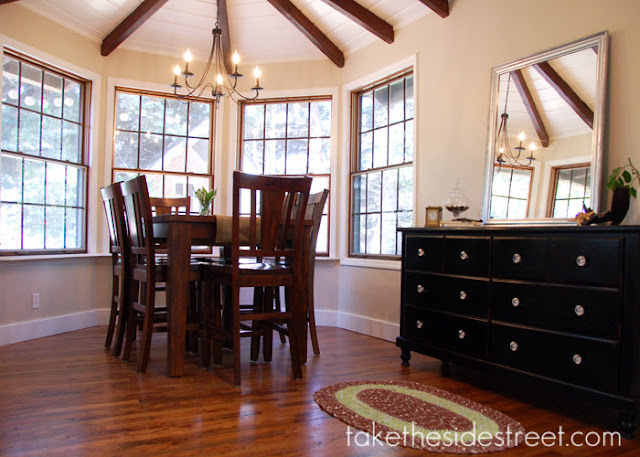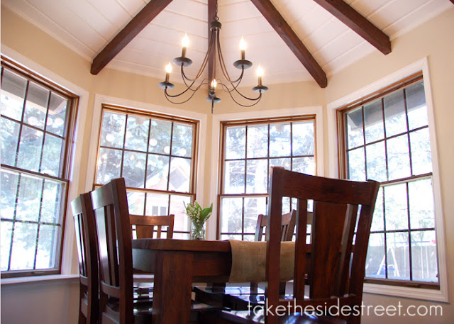 Back to the joy, though... love my dining room! Love it, love it, love it! It's so bright, and although I originally left the beams dark to appease the husband (men and their stained wood, go figure), I actually like the contrast and I think it ties the ceiling in nicely to all the dark wood windows in the room and throughout the house.