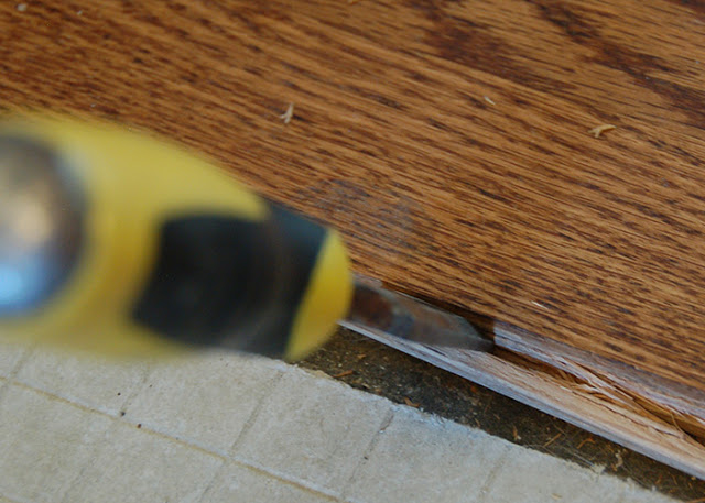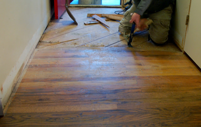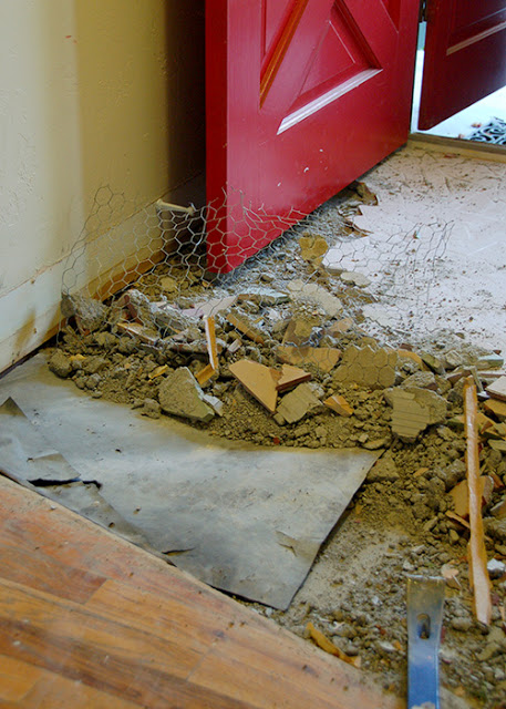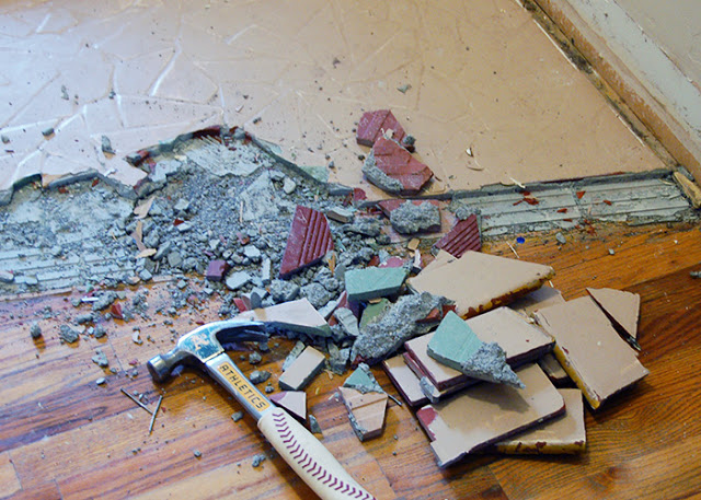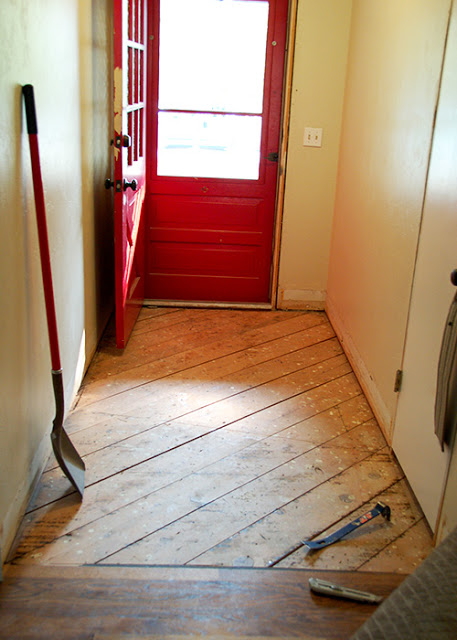 Do you see the faint diagonal line about halfway between the door and the wood floor? That's a saw cut. Which means that originally, my entire entry was wood and someone, somewhere along the line, purposefully removed it and chose to add red and green broken tile mosaic. This distresses me, but we're moving onward and upward now.