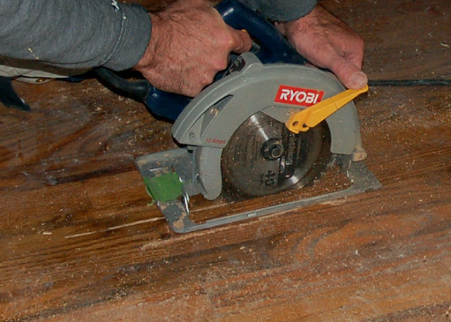 My contractor friend "Joe the Builder" (his requested moniker -- can he build it? yes he can!) set the saw height so that it would cut through the floor without cutting through the subfloor, and cut through the middle of the last board set to be removed.
