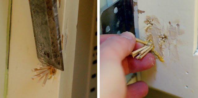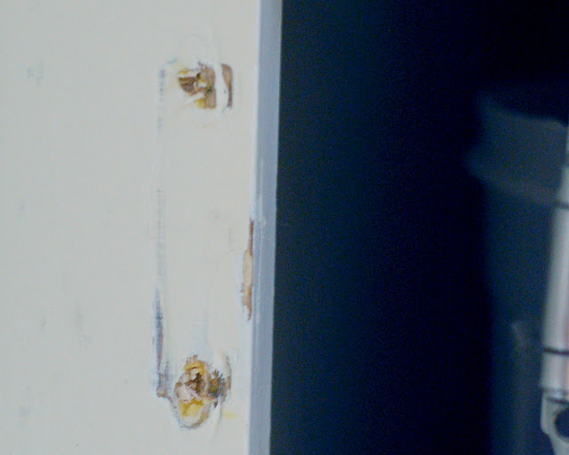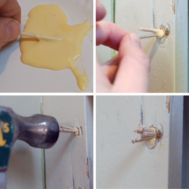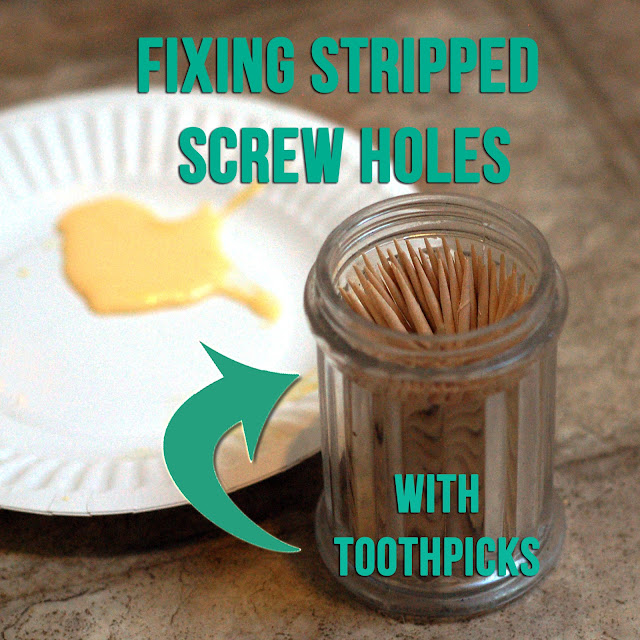 I'm using this bigger kitchen project as an excuse to focus on some of the smaller details in the room too. First up, stripped screw holes in the wood -- I had some in both the