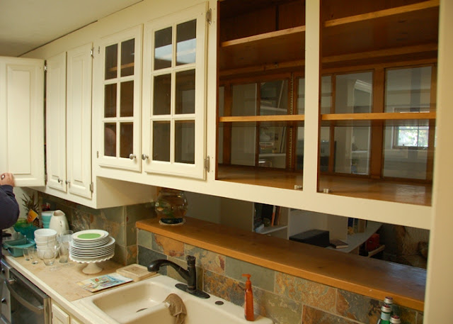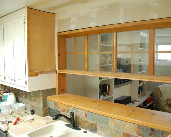 The wall behind the sink was a single long cabinet box, so that came off in one piece and left the larger opening with an interior window frame that we also removed, and an incomplete side on the neighboring cabinet box.