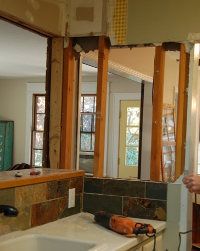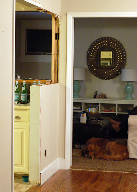 The other day though, when I was supposed to be spending time and energy on my tile entry, I was talking my contractor friend Joe the Builder into tearing up my kitchen wall. My husband (who was aware of the plan, in my defense) was alerted to this decision by a picture message while he was in business meetings. This project spontaneity is how I keep our marriage fresh, or how I keep him on his toes, or maybe just how I maintain my motivation to keep running faster and farther than he can.