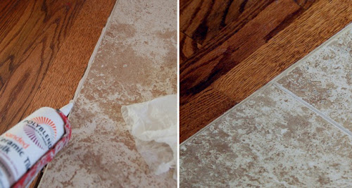 You should apply tile caulk where vertical or horizontal surfaces meet -- in this case, where my wood floors meet my tile floors. It flexes more than grout but still looks similar to it so you doesn't ruin the overall aesthetic by having a giant white latex caulk line down your floor. Sometimes $7 bottles of caulk are worth it, y'all.