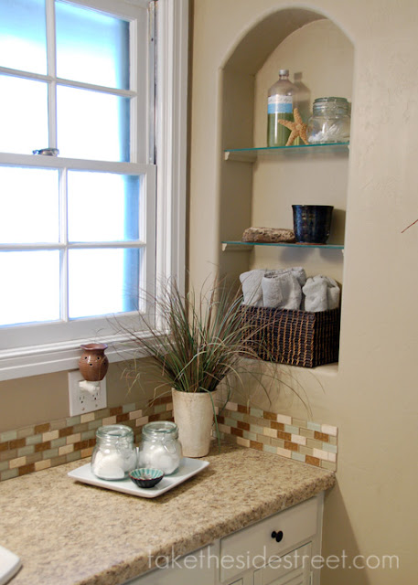 The knobs go with the mirror, the faucet matches the light, we have pops of blue in the tiles, a jewelry bowl, towels and the shower curtain... we're just plain crazy adventurous over here, guys. This is how I get my adrenaline rushes as I will never, ever (ever) do things like jump out of planes or stand over the Grand Canyon or Chicago on clear glass platforms. My stomach is twisting just writing about it... blerg.