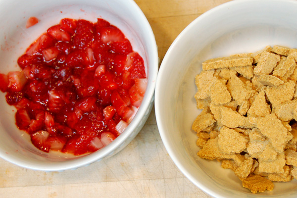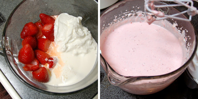 I used frozen strawberries because it takes one 16-ounce bag (easy!) once they thaw in the microwave they're so soft I was able to mix all the ingredients with a hand mixer instead of a blender or a food processor. I like things that are easy.