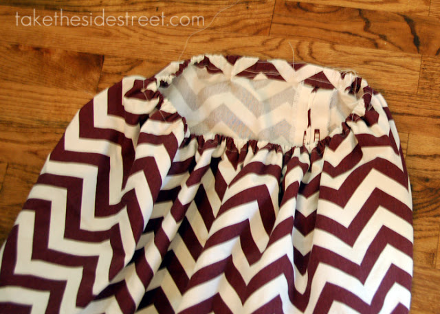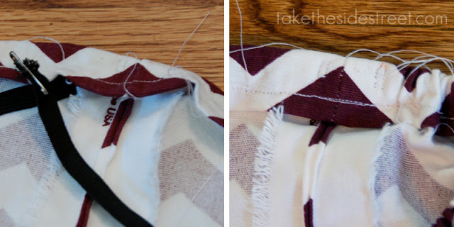 I sewed one end of the elastic into the skirt and threaded the other end through the waistband I created by using a safety pin in the other end of the elastic. Sometimes this takes some wiggling! Once I got the elastic all the way through, I pinned it in place and then sewed it securely. Then I sewed the last few inches of the waistband closed.