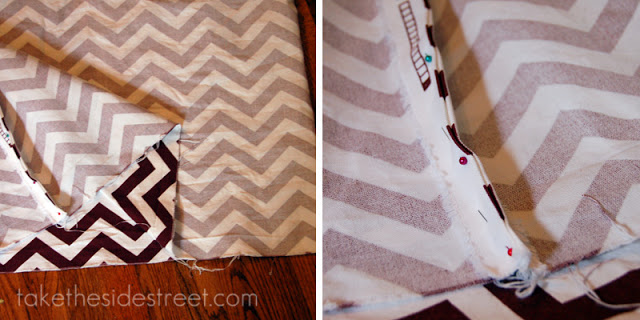 This home decor fabric is 54" wide, which means I only needed a yard to make a nice short skirt. I folded it in half hamburger-style to make a giant tube 36" long. Next, I folded the selvage edges back, did my best to match the zig zag print and pinned it.