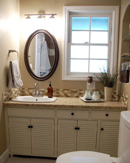As promised, I spent Labor Day weekend laboring -- I'll show you what I'm working on outside tomorrow, but today I wanted to unveil the changes I made to our upstairs bathroom. I had asked for your thoughts on painting the vanity a creamy white, and that's just what I did...