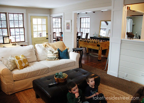 Without that jarring wall of knotty pine, the entire space feels roomier and all the windows really pop -- have I mentioned that I love the dark mullions with the white trim? I didn't know how I would feel about them when I first decided to paint, but now I'm 100% on board. Kind of quirky. Lots of charm.