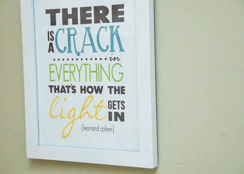 First, I sat down and created a little graphic using a favorite lyric from a Leonard Cohen song called "Anthem." The lyric reads in part, "there is a crack in everything, that's how the light gets in." I love the sentiment behind this, I feel like it's about how imperfections are everywhere and that these imperfect things are beautiful and wonderful because of their flaws, not in spite of them; perfection is overrated and stifling. It's a freeing, lovely thought and one I wanted on my wall.