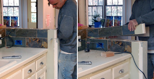 I had Joe remove the wall behind the top later of slate tile so normal 30" bar stools would fit this new mini breakfast bar space.