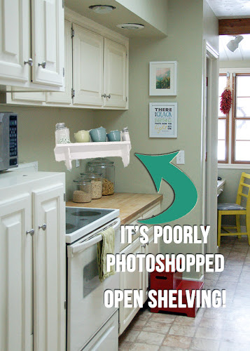 What do we think? Would a shelf under that cabinet look too country or maybe even out of place on its own? I'm not sure how I feel about the wooden brackets... I like them in other kitchens but wonder if floating shelves would be better in mine. Let's discuss.