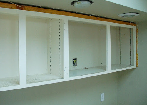 One of my hidden talents is taking a simple idea and running a million miles away with it until it's nearly unrecognizable. Case in point: after we chatted about adding a shelf below my squatty too-short upper cabinet, I naturally began considering my options...