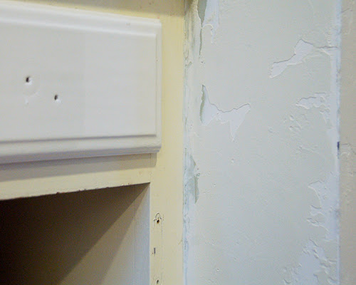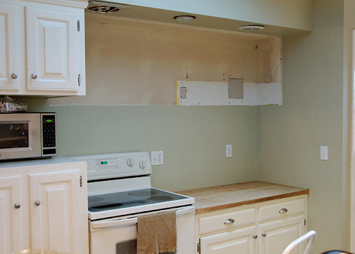 Last Saturday, I rolled up my sleeves and removed a couple of cabinets in my kitchen, and was left with a little mess to clean up. I can do a lot of things, but mesh tape + joint compound + fancy textures isn't on my list of skills. (although I do have nunchuck skills, bow hunting skills, and computer hacking skills... Mike only wanted a wife who had skills.)