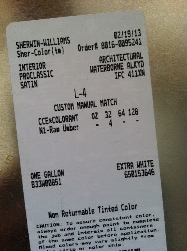 The color I chose was a custom mix called "L4 white" that my Sherwin Williams mixes for a lot of painters - I don't know if it's a company-wide or a regional thing, but I first heard about it from our contractor friend and have been using it for my trim ever since.