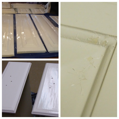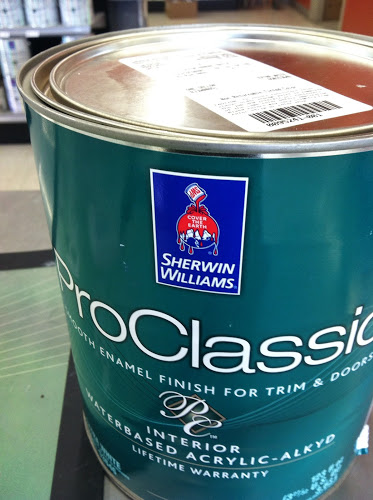 The paint guy gave me the wrong paint. Aaaahhhhh!!! This was regular acrylic latex (albeit a bit fancier and harder because it's in their ProClassic line). The chipped stuff all over my cabinets was acrylic latex... I wasn't going down that road again, even if this paint was 10 times nicer than the stuff I had sprayed 3 years ago.