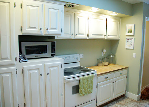 Problem #3: At the same time the crackling paint disaster of 2013 was happening, our contractor buddy came over to put a cabinet box above my range to mount the microwave to, and when he got here we realized the cabinet next to it was too deep for the microwave to open... so he had to rip out yet another cabinet, cut it in half and replace it before he was able to even get started.